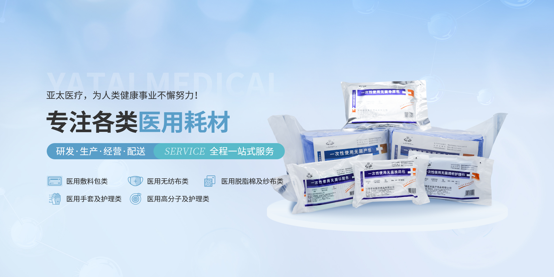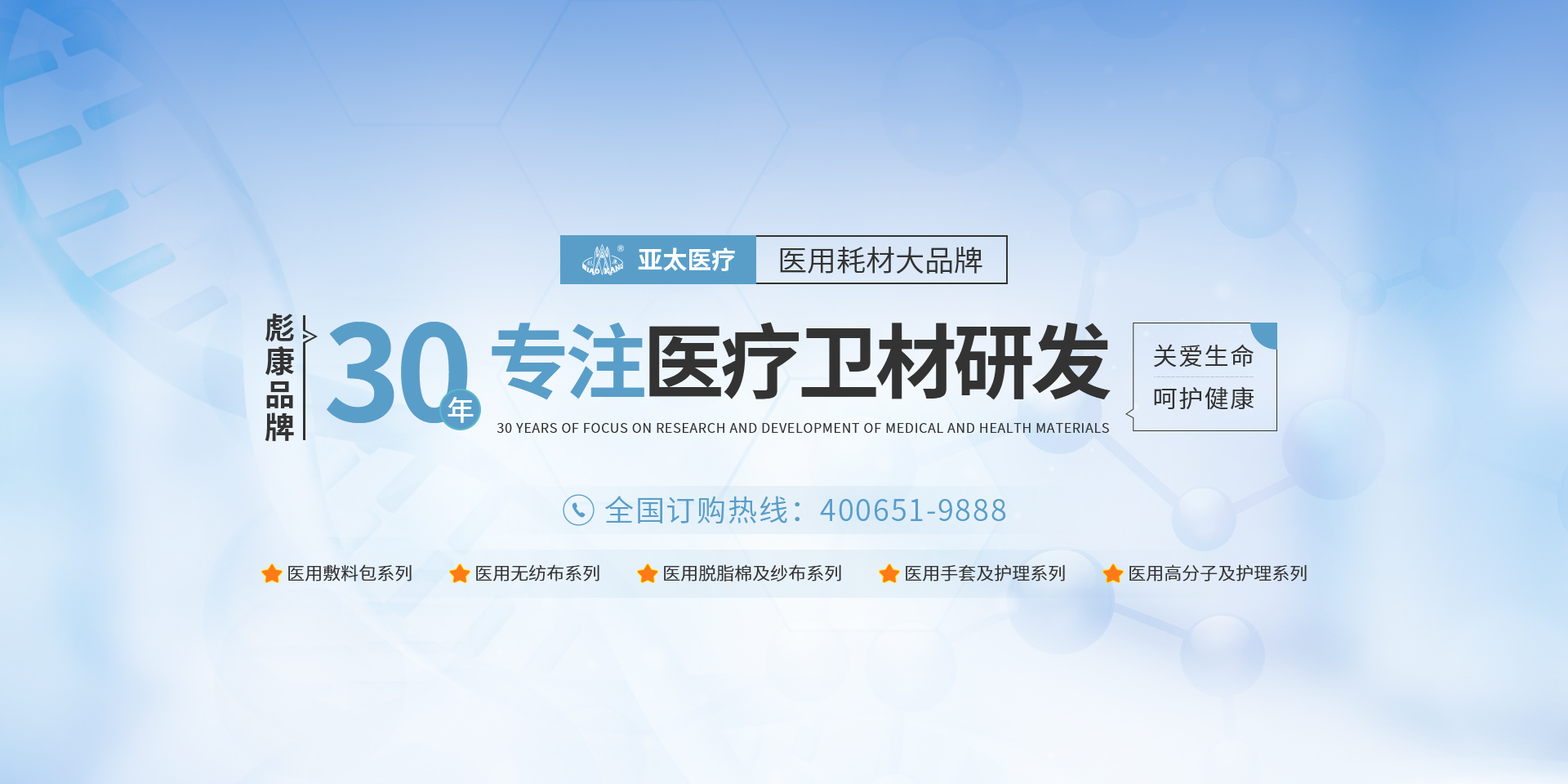 亞太始終專(zhuān)注于一次性醫(yī)療器械、衛(wèi)生材料、高分子及敷料產(chǎn)品的研發(fā)、生產(chǎn)和經(jīng)營(yíng),為人類(lèi)健康事業(yè)的發(fā)展帶來(lái)深遠(yuǎn)的意義